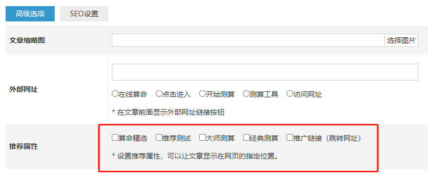 网站首页的算命精选、推荐测试版块(均可自定义版块名称,内容数量,仅限首页显示),可以作为测算工具的入口链接,通过分类编辑——推荐属性,选择对应属性的文章将显示在这里。