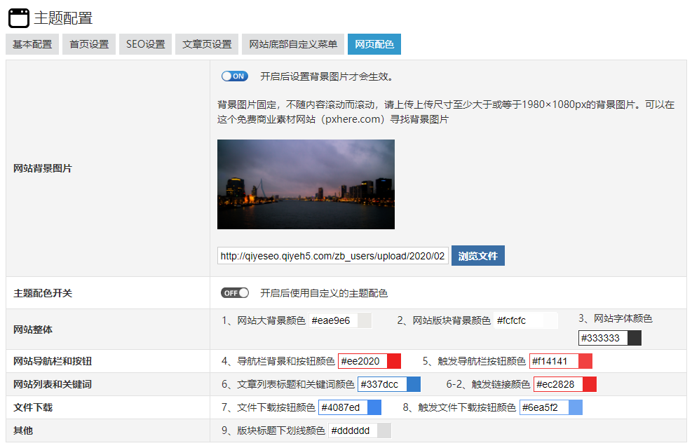 2、网站的颜色可以通过主题配置——配色功能,自行搭配;