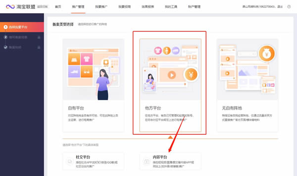 点击网站导航栏推广管理——点击新增媒体备案——点击他方平台——选择内容平台——点击下一步填写备案信息